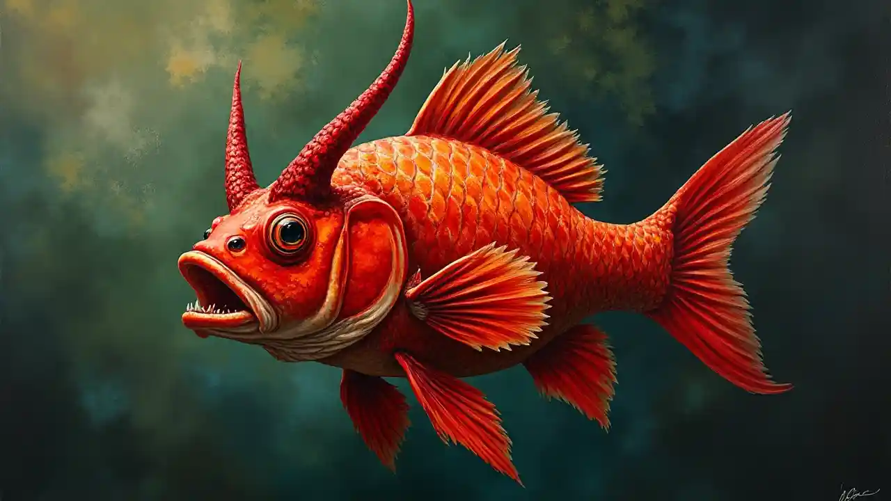 Demonismi punainen kala punaisilla sarveilla, maalaus Norman Rockwellin tyyliin, hyperrealistinen, erittäin yksityiskohtainen