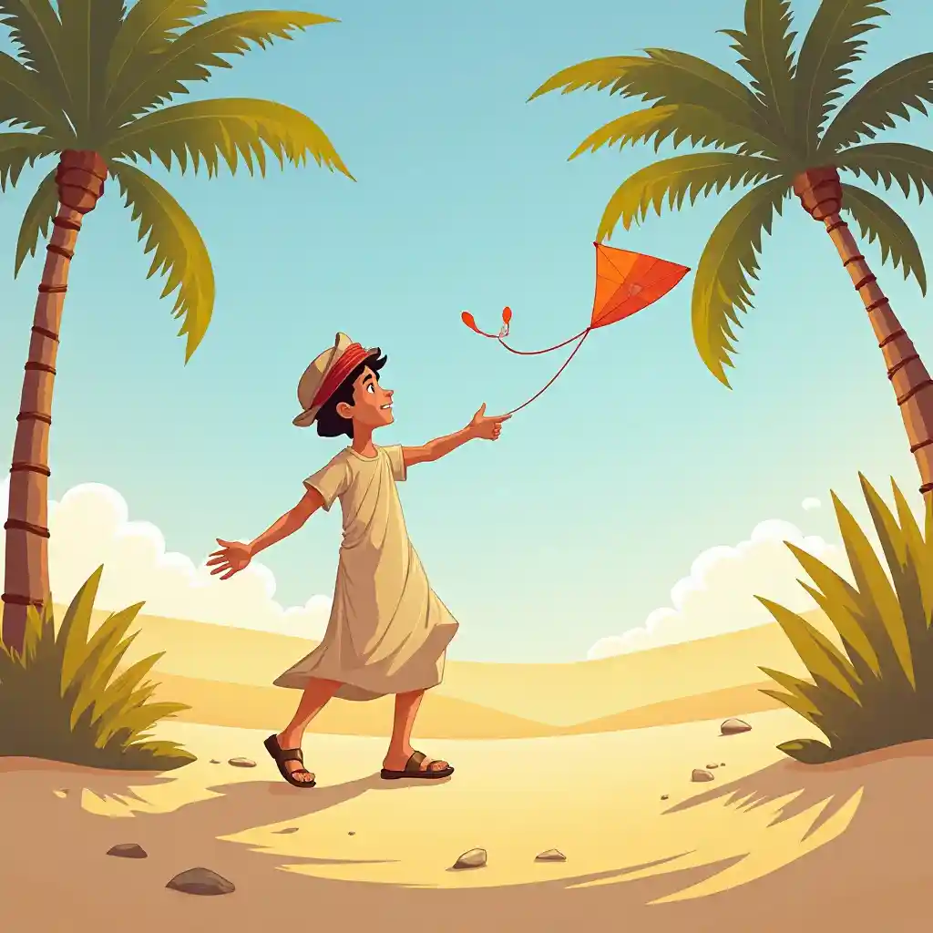 Flying a kite in a desert oasis, an 8-year-old Middle Eastern boy with a cap wears a tunic and sandals. Palm trees and golden dunes frame him, his eager tugs radiating freedom and sunny adventure in a serene, exotic scene.