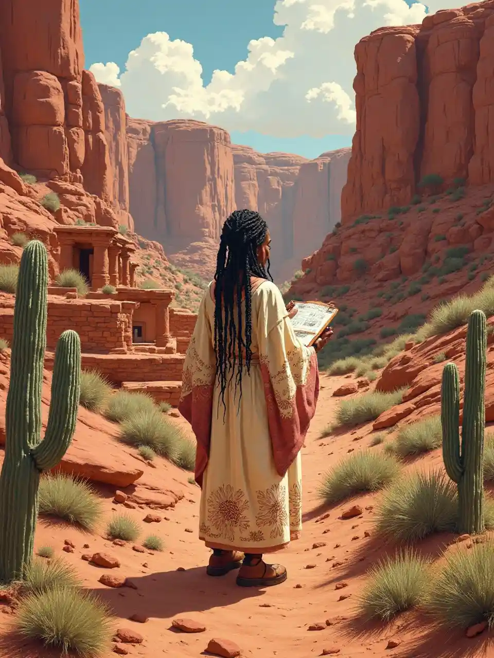 78-vuotias musta nainen, jolla on nenät, piirtää aavikkokanyon raunioita. Punaiset kallioita ja kaktuksia kuvaavat häntä, ja hänen tarkkoja linjojaan säteyttää uteliaisuutta ja historiallista hämmästymistä dramaattisessa kuivassa. Hänen taiteensa vangitsee unohdetut tarinat.