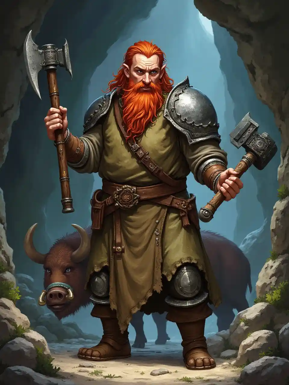 Kääpiö D&D 5:stä. Hän pitää toisessa kädessä kirvestä ja toisessa vasaraa. Hänellä on salpa-asu. Hänellä on punaiset hiukset ja haarautunut punainen parta. Hänen vieressään on sika satulla. Hän on luolissa.