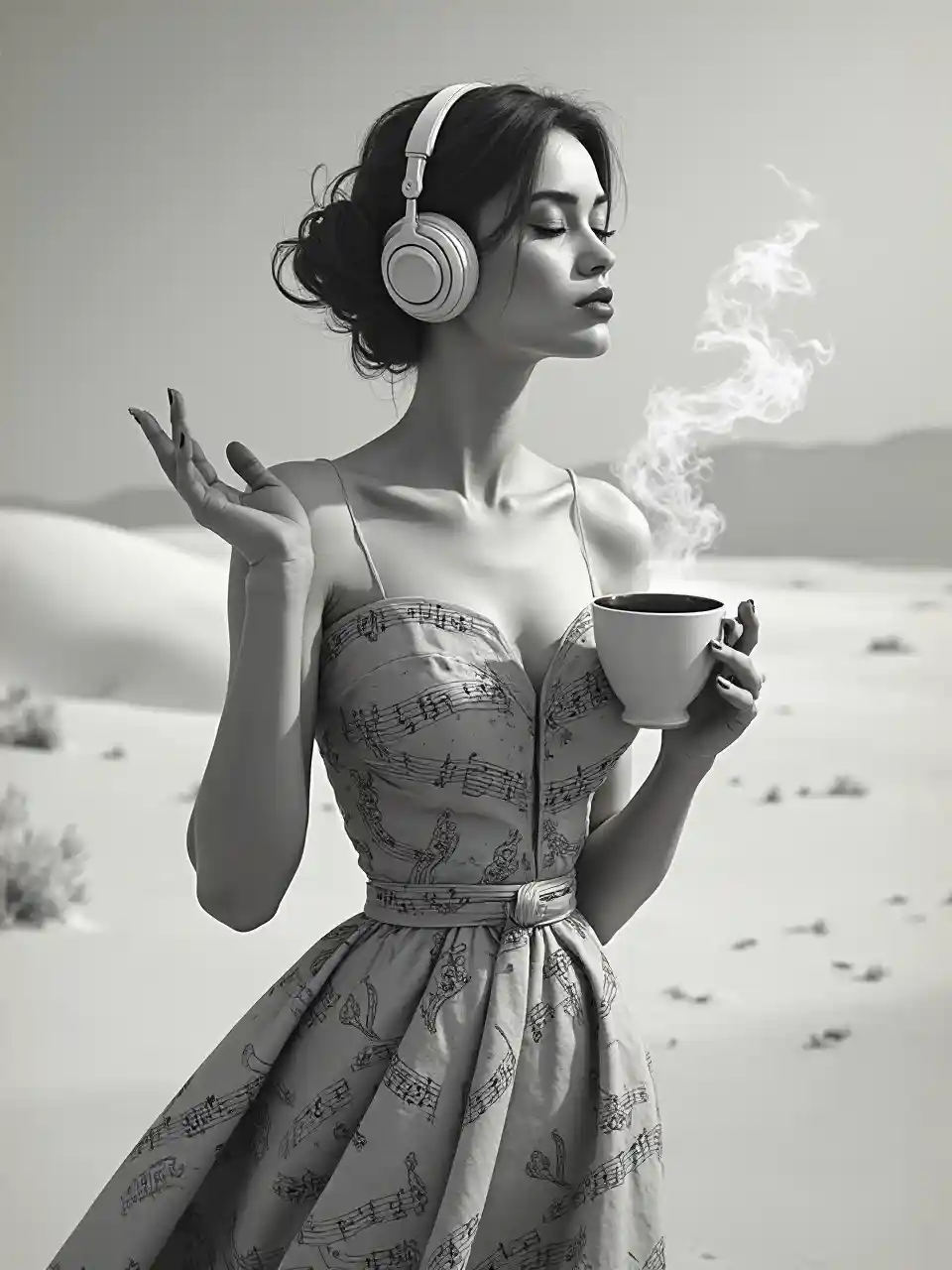 Mustavalkoinen naturalismi maalaus, rentoutunut musiikillinen elegantti avantgardiainen nainen, jolla on höyryntävä kuppi kahvia, seisoo autiossa valkoisessa hiekassa steampunk-aavikossa, kuulokkeet, musiikkilauseet, jolla on musiikkilauseet paper mache -teksturit musiikkilauseet puku, joka luo geometrisia avantgardia muotoja, kerrostut peiliportit, surrealistinen, jolla on herttainen kaula, makaappi, tumma, hunkka. Auringonko