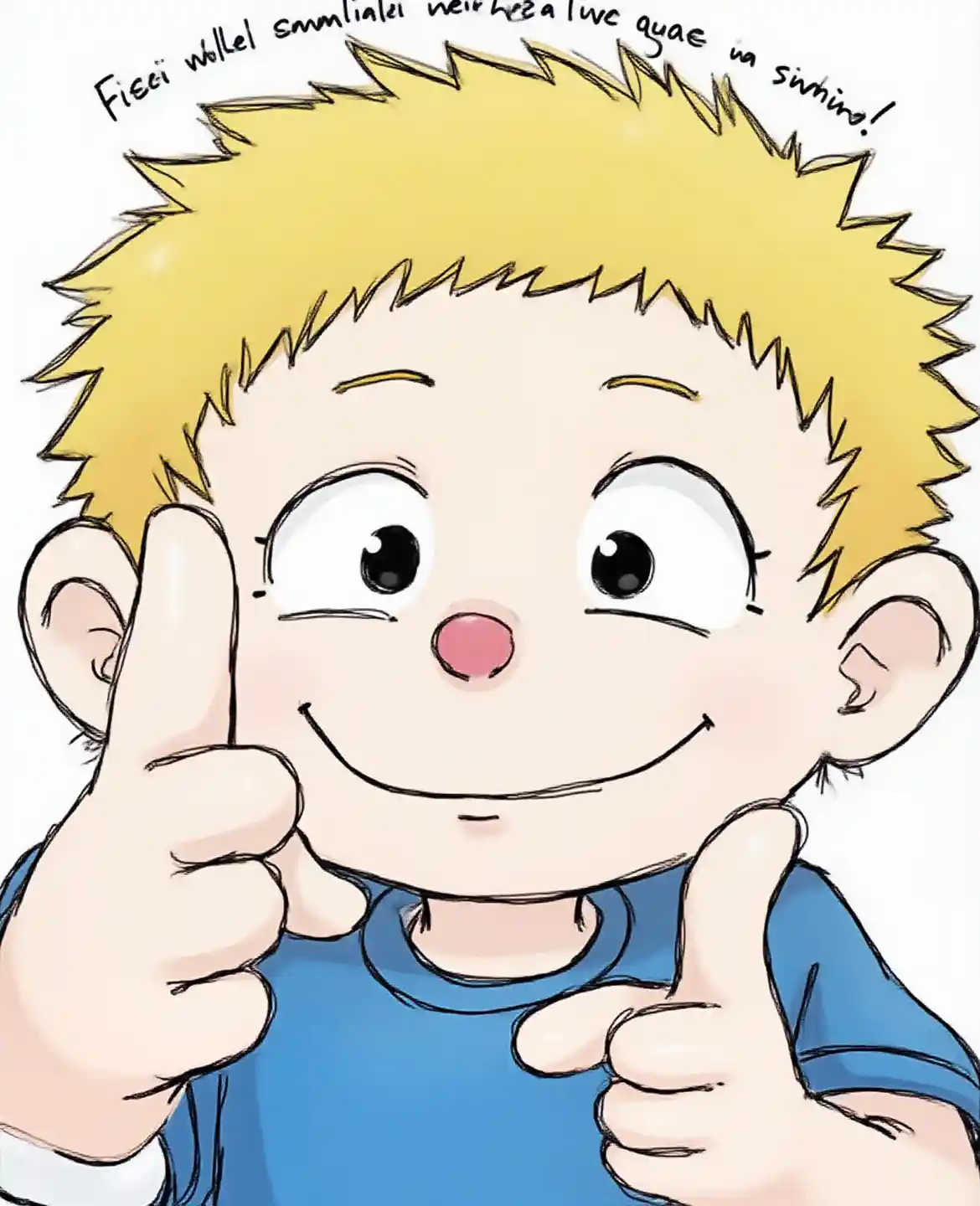 Kuvassa on sarjakuva vaaleanpunaisesta nenästä, sinisestä paidasta, jolla on peukalo ja joka sanoo espanjan kielellä "Feliz cumpleanos".