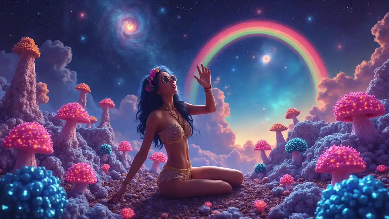 -Hän esittää jonkin galaktisen sarjan tähtiä. Hän rentoutuu hämmästyttävässä ihmemaailmassa täynnä pimeässä hehkuvia sieniä, jotka näyttävät alkavan nauraa milloin * ylimääräinen * Ja ne villit fraktaalikuvat, jotka aallossa kuin he yrittäisi tehdä vaikutuksen. Taivaan? Se ei ole vain tavallista avaruutta. Se on täysi galaktinen disko, jossa tähdet vilkkaavat kuin heittäisivät, sumut pyöräilevät kuin kosminen laavalamppu, ja suuri sateenka vain ulottuu ympäri maailmaa, kuten: "Kyllä, minäkin olen täällä". Värit ovat niin äänekkäitä ja psykedeelisiä, että silmät tanssivat. Se on hauskaa, outoa ja täysin erilaista". * - Ei. - Ei - Ei - Mitä?