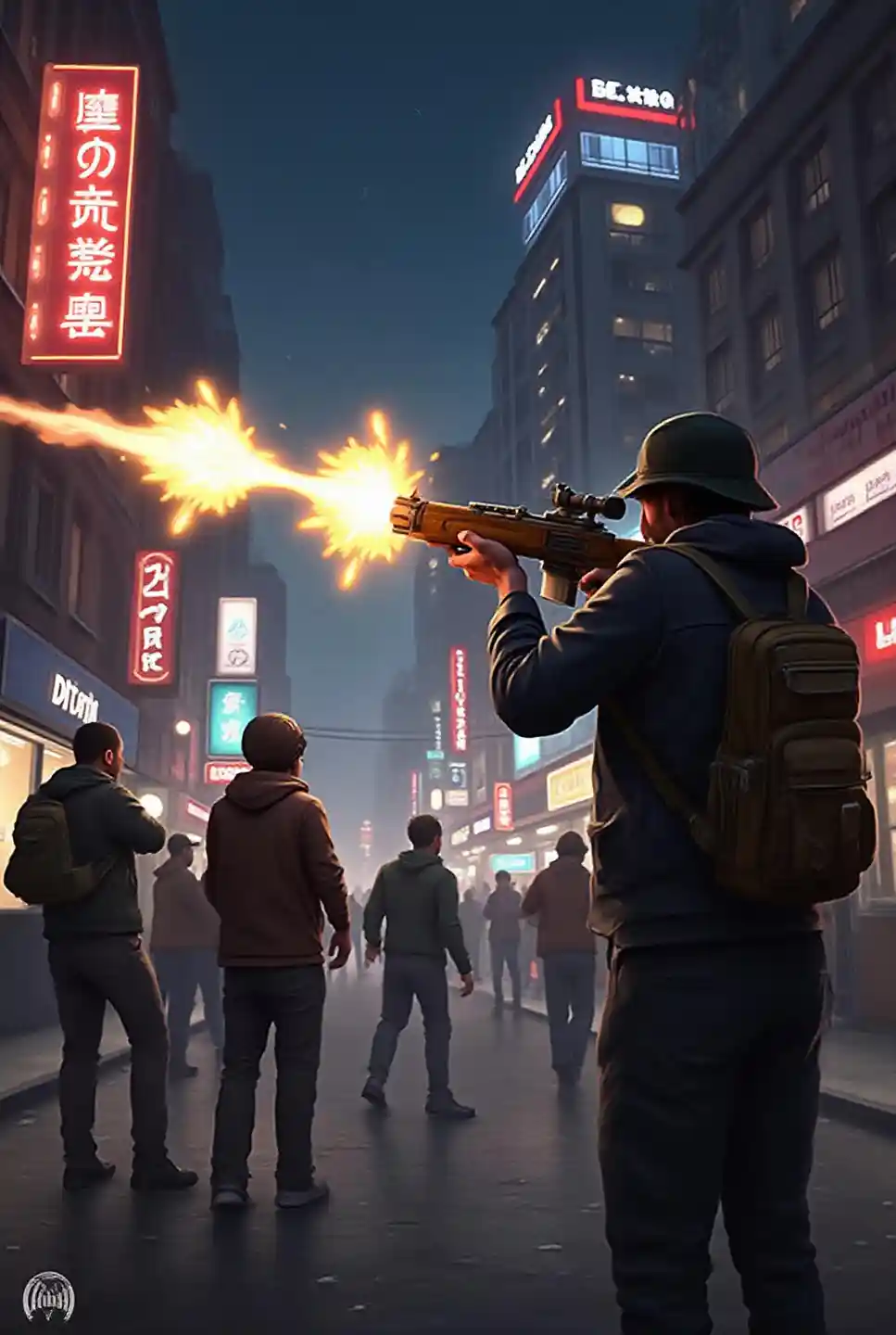 superrealisti, jengitappelu, jengit tähtäävät ohjuslaukaisijan kanssa, luodit lentävät minua kohti, luodin reitit, yö kaupunki neon valo