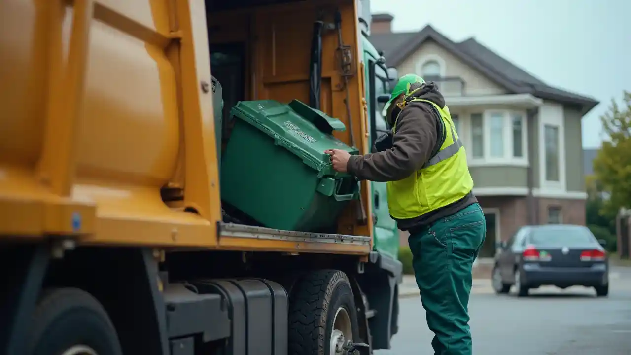 Roska-auton työntekijä tyhjentää roska-aluksen