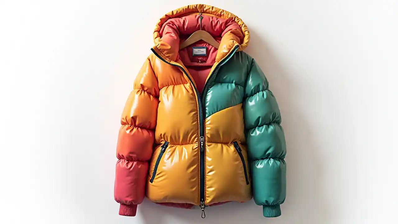 JackSuperkiiltävä värikäs pufferi takki, suurikokoinen, valkoisella taustalla, eristetty, malli
