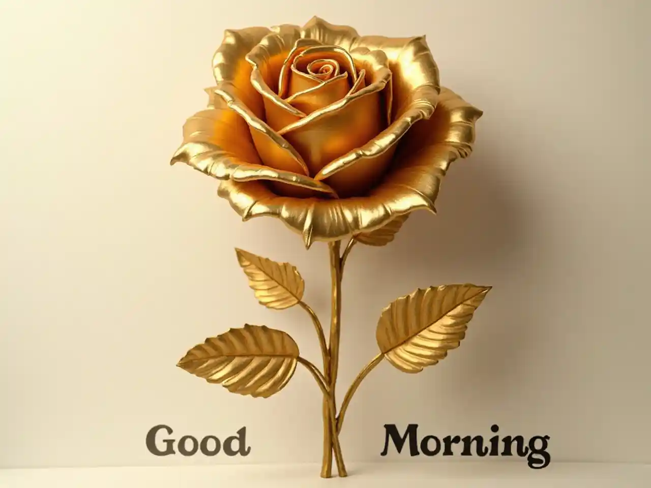 Kauniisti valmistettu kultainen ruusu, jonka sivut ja lehdet ovat yksityiskohtaiset, on tyylikäs ja säteilee ylellisenä. Ruusu on kiillotettu ja runsaasti muotoiltu, ja jokainen käyrä ja taiko on suunniteltu pitämään kiinni luonnossa olevasta kauneudesta. Kukin alla on rohkeasti esitetty lause "Hyvää huomenta" paksalla mustalla kirjaimella, joka on jyrkä vastakohta ruusulle ja joka kutsuu lämpimästi ja positiivisesti. Koko säveltäminen on sopusoinnussa, jossa on taiteellinen kosketus ja sydämellinen tervehdys, joka sopii täydellisesti herättäviin tunteisiin. Valaistus korostaa ruusun metallikkautta ja korostaa sen huomattavaa läsnäoloa aamuviona.