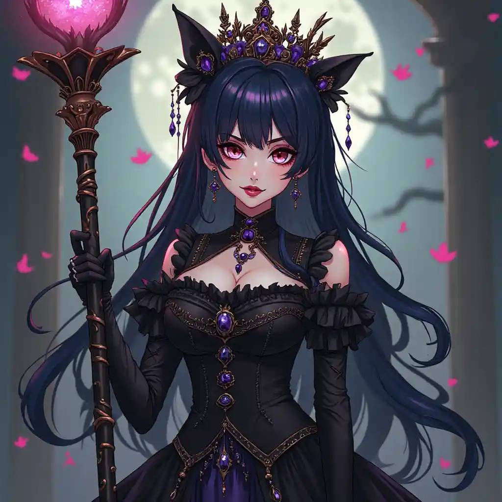 WilliamAnime taika tyttö gootti koristeinen viktoriaaninen puku kruunu ja gootti meikki ja lävistys pitämällä taika sauva
