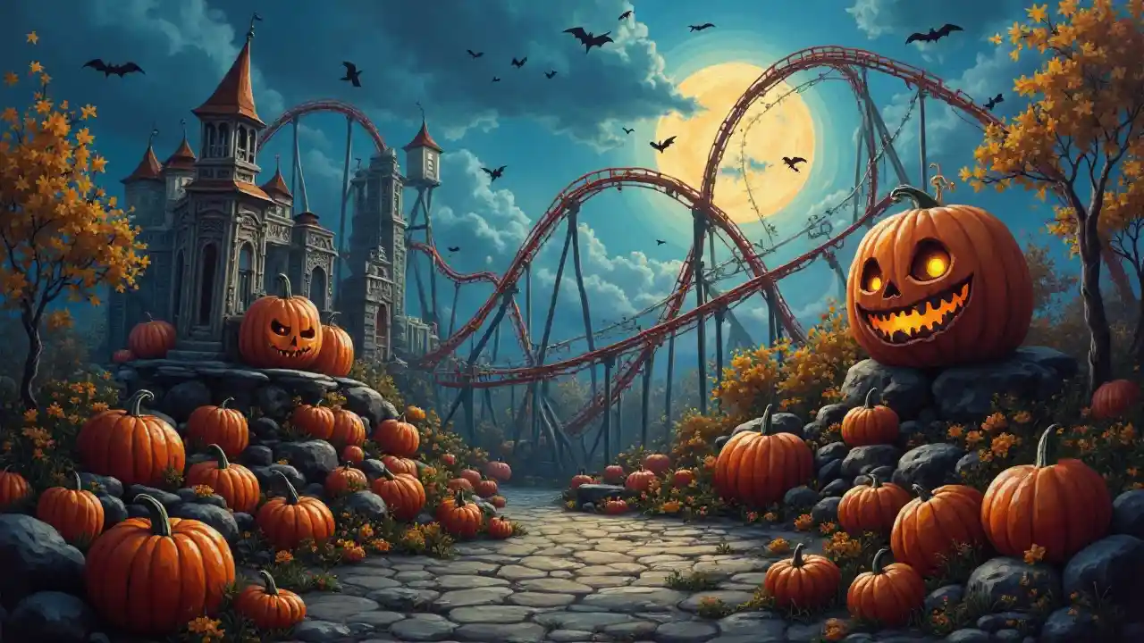 Halloween-teematarkki, jossa on vuoristorataa ja pelottava kurpitsa