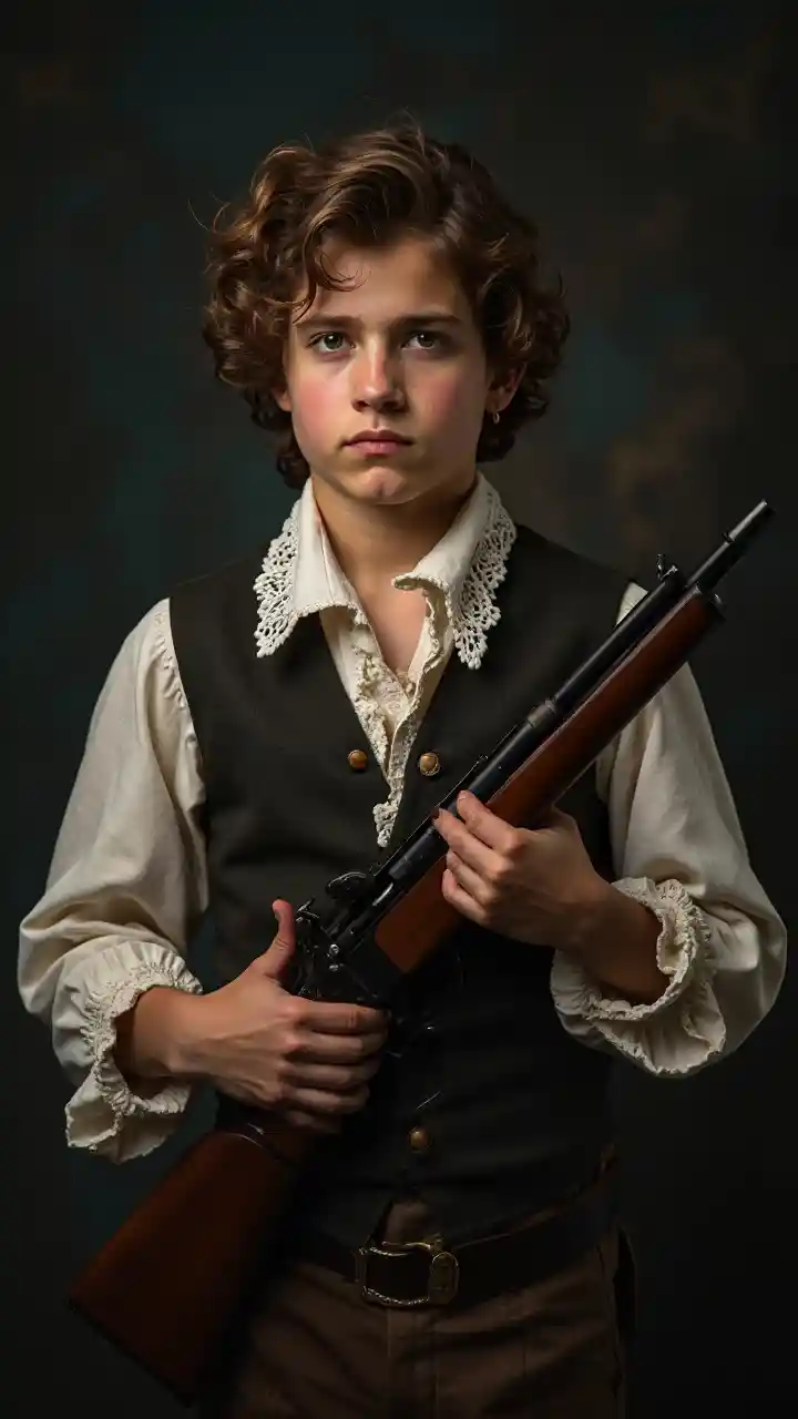 Tosi vakava nuori mies historiallisissa vaatteissa ja aseella