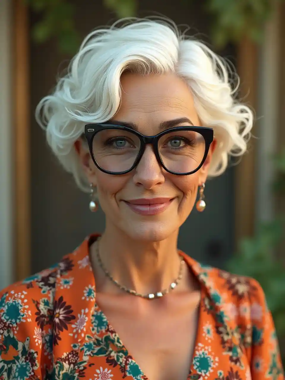 Kuva kaunis tyylikäs vanhempi nainen, - jolla on valkoinen platina, lyhyt tukka ja isot silmät, - houkutteleva Hollywood-kuva, erittäin realistinen, daz3d, naiset suunnittelijat, korkea resoluutio, hyvin muodikas, pukeutuu nuoksiin, Wes Andersen tyyli