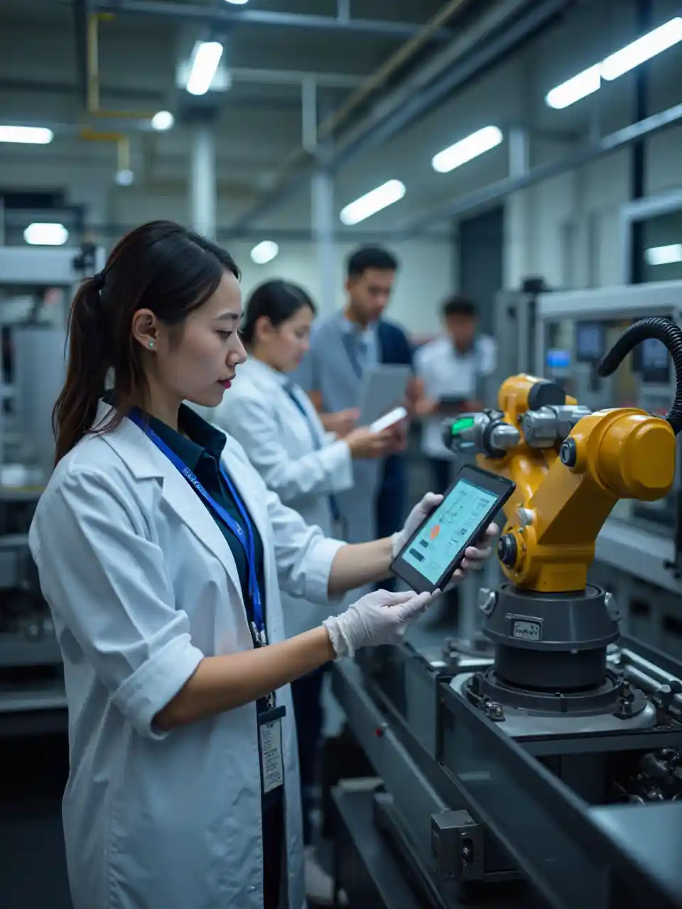 "Teollisuuden harjoitteluhetki" Työtaito: Yritysvalokuvaus Näyttämö: Nuori polytehninen harjoittelija (aasialainen nainen, 20-vuotiaiden alku) korkean teknologian tuotantolaitoksessa, jolla on yrityksen tunnus. Hän on.. Robottivarren säätöjen säätö vanhemman insinöörin valvonnassa Digitaaliset HUD-näytöt, joissa on taustalla olevia kaavioita Yksityiskohdat: Puhdas teollisuusympäristö automaattisilla kuljetusnauhoilla. Kollegat tarkistavat tablettia. Tilanne: Ammatillinen, tulevaisuuden näköinen, osaamisen kehittäminen