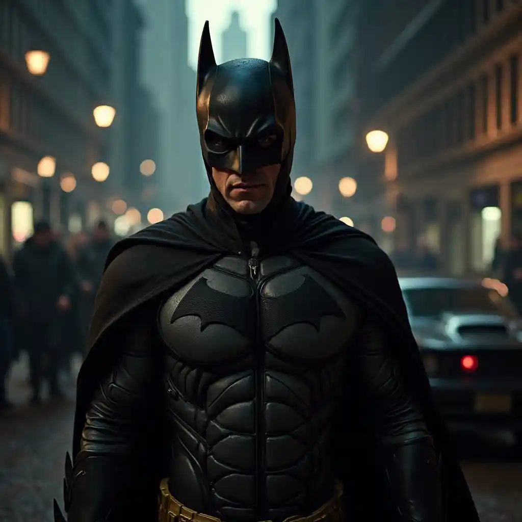 VictoriaJohn Hamm pukeutunut Batmaniksi, joka pitää Batmanin konepyyhdystä, lepakkoa ja lepakkopyytä taustalla