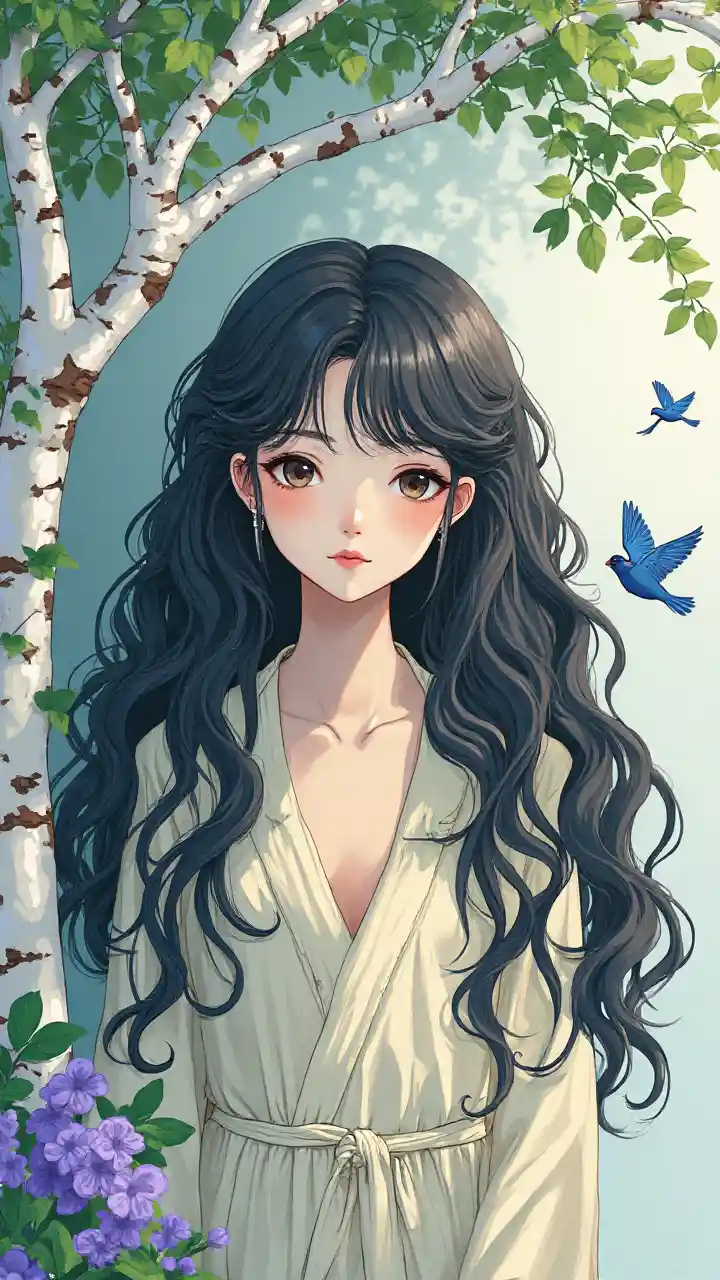JosephKaunis, söpö etukuva Korean ninfa, iso, pitkä kihara hiukset, yrtit pastelliväriset, valkoisen puun vieressä vihreillä lehdillä, lentävät siniset linnut, violetti kukka