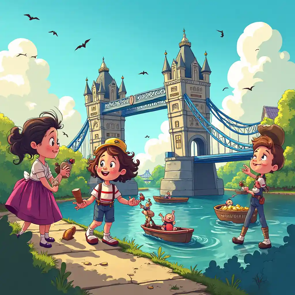 Leikkisä piirretty kuvaus Lontoon sillan harhaisevasta romahtamisesta