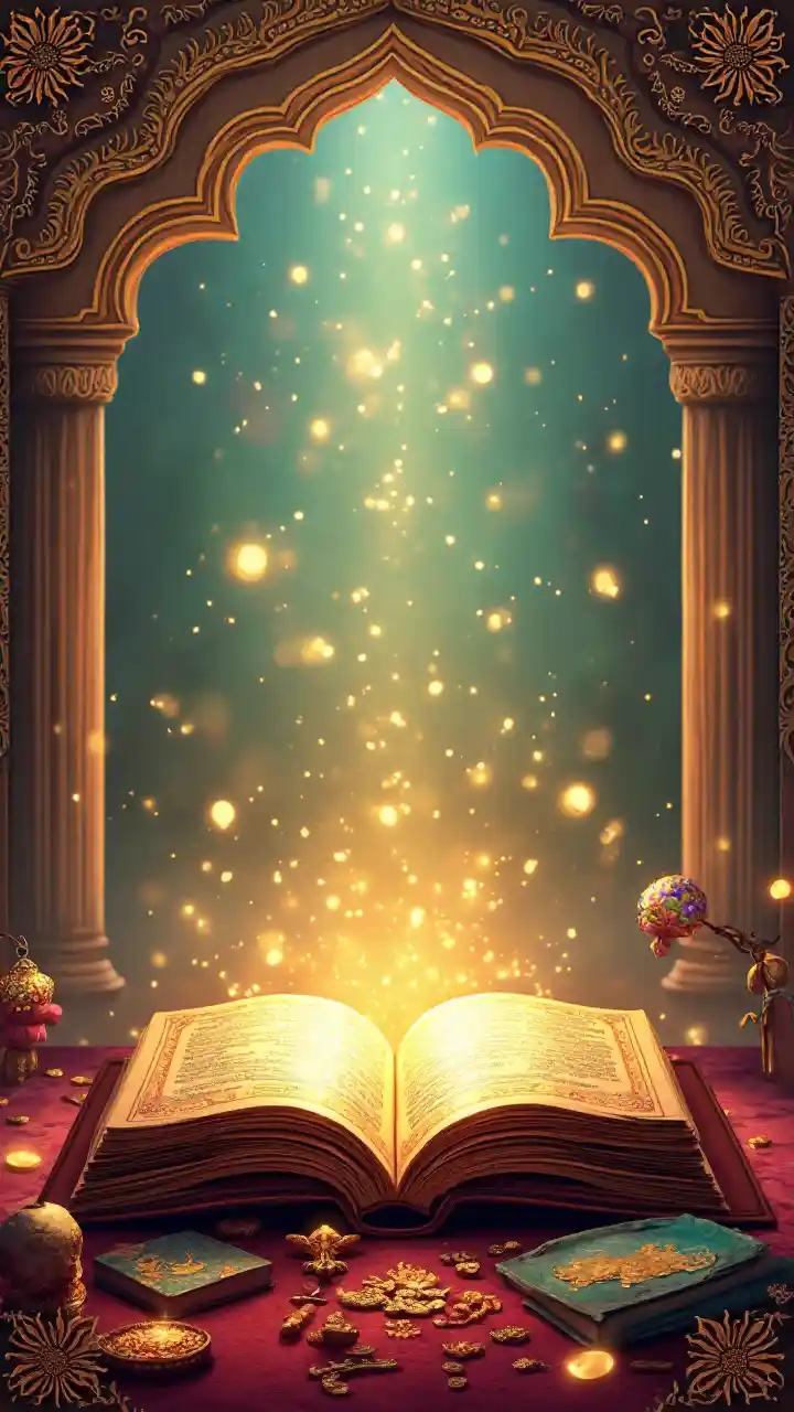 Taiteellinen intialainen lappu, jossa on avoin kirja ja värikkäitä kuvia Majlis-e-Kahanin Facebook-sivulle