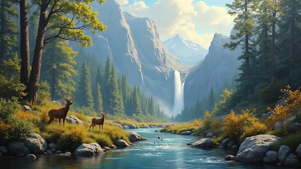 maalaus vuoristojoesta, jossa on peuroja ja lintuja ja vesiputous taustalla, jossa on vesiputous ja metsä, Chris LaBrooy, naturalismi, yksityiskohtainen matta maalaus