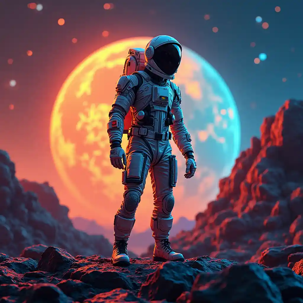 Avaruusmatkailija mustassa kivessä keskellä universumia. Futuristinen ohut astronautti puku neonista futuristinen ainutlaatuinen kypärä, supersankari tyyli puku, energia räjähdys taustalla, avaruusso, enemmän neonia, energia räjähdys, fluori värit, oranssi, sininen, musta violetti, elinvoiva, paljon graffittia puvussa. Raaputus puvussa, Kivet kuten Mars, tulivuori, elokuva julisteen tyyli, sota, melu, Star Wars, sLall war kypärä, ei tarvikkeita, ei kypärää, taiteilija, graffiti, taide, revel, neon, äärimmäinen väri, energia räjähdys, energia valo, mystinen, voimallinen