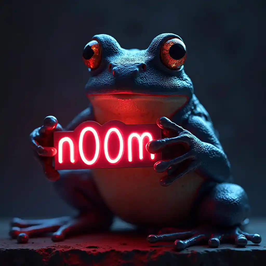 musta sammakko, jolla on neon-merkki, jossa lukee "nO"