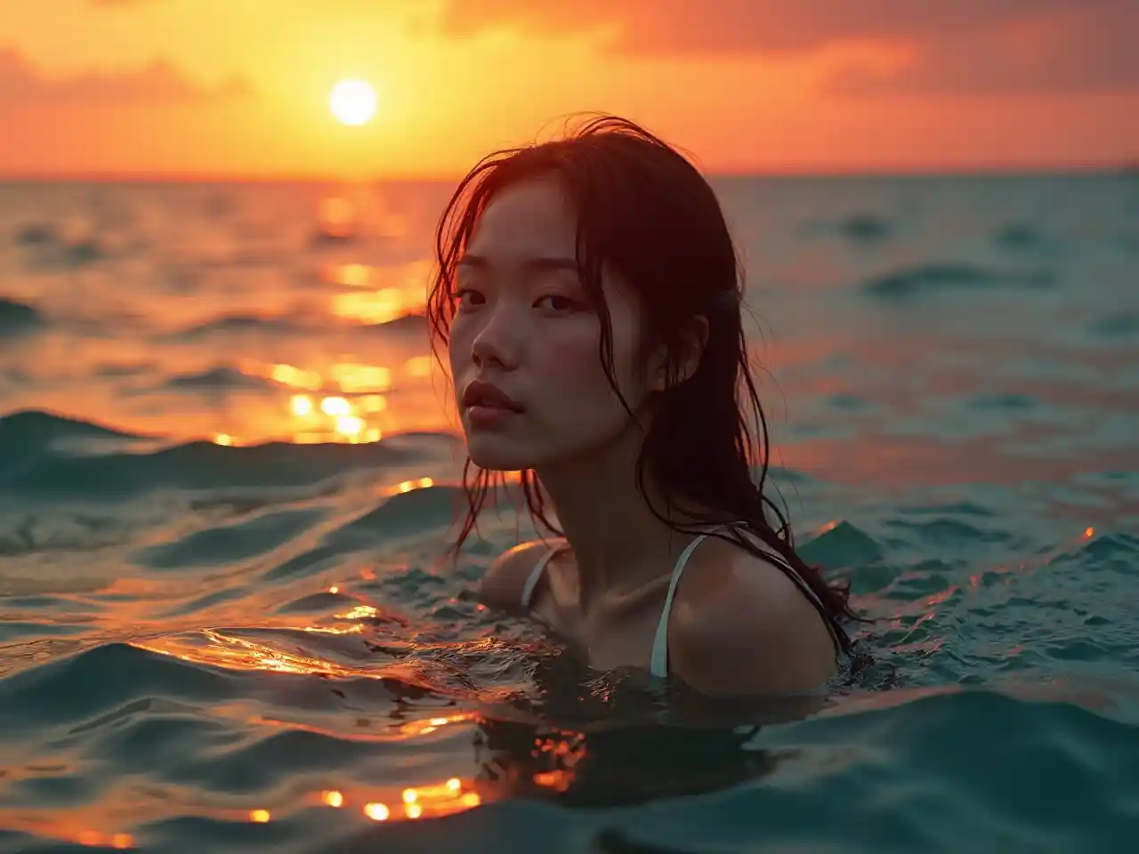Nuori nainen uppoutuu mereen auringonlaskun aikana. Näyttely on koristeltu räpähdys-ja-häviö- yksityiskohdilla, jotka sisältävät hetken esteettisen kuvan. Kuvassa on valoisa sädevaihteinen vaikutus, joka sulautuu saumattomasti poolcore-viibreihin.