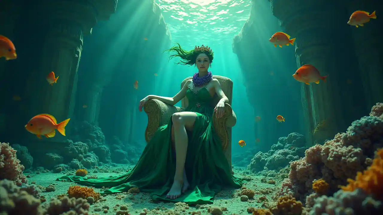 Suuren kulman kuva syvyyden kuningattaresta, hämmästyttävän kaunis ohut, pehmeä nainen, hänen hiuksensa ovat pitkät vihreät ja (painoittomat) kelluvat vedessä, hänen ihonsa on vaalea ja hieman sininen, hänen silmänsä ovat vesipunaiset, suuret ja ilmaisevat, hänen huuliensa ovat täynnä vietteleviä, hieman erillisiä, ne ovat värillisiä, hän käyttää (koralli) päähän, (oranssi & vihreä mustanmainen) kiertää kaulaansa, pukeutuu kuninkaalliseksi ja tyyliksi (merilä) (rikas elävä vihreä tekstuurinen & koste) Hänellä on pitkät jalat, paljat jalat ovat vaippaisia ja siivet, hän istuu korkealla (koralli) valtaistuimella, jossa on kreikkalainen ja atlanttinen arkkitehtuuri, korut ja aarteet laatikosta, bioluminesenssinen kasvilaika valaisee huoneen sinisellä valolla, kun kultainen auringonvalo suodattaa yläpuolelta. Grottossa uivat erilaisia erittäin eläviä ja värikkäitä trooppisia kaloja. Hyper yksityiskohtainen, realistinen, tarkka.