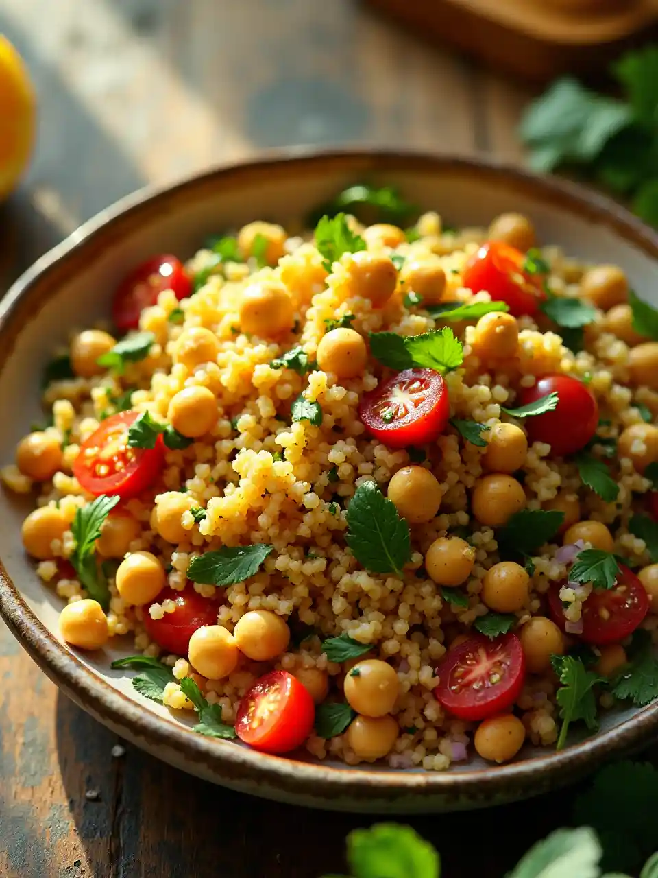 Realistinen oranssinvärinen quinoa-salaatti, vaahtoinen quinoa, jossa on appelsiinimehua ja kananlihaa, tuore paloitettuna (kurkku, puna sipuli, persilja, kiljanpuna, sipinatti, tomaatti), proteiinipakkaus, jossa on villi sitruuna- hunaja curry vinaigrette, virkistävä ja ravitseva, kauniisti järjestetty, auringonvalo valaisee ruokaa, jossa on erittäin yksityiskohtainen, lämmin väri, joka lisää viileän ilmapiirin, joka sopii kevaan tai sivuat, joka on herkullinen ja terveellinen