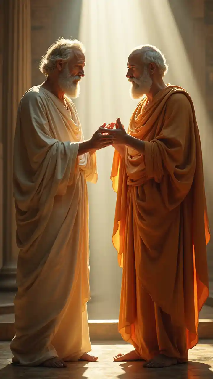 Sokrates kasvot kohti Platonia. Sekä koko kehon asennossa että käden eleillä.