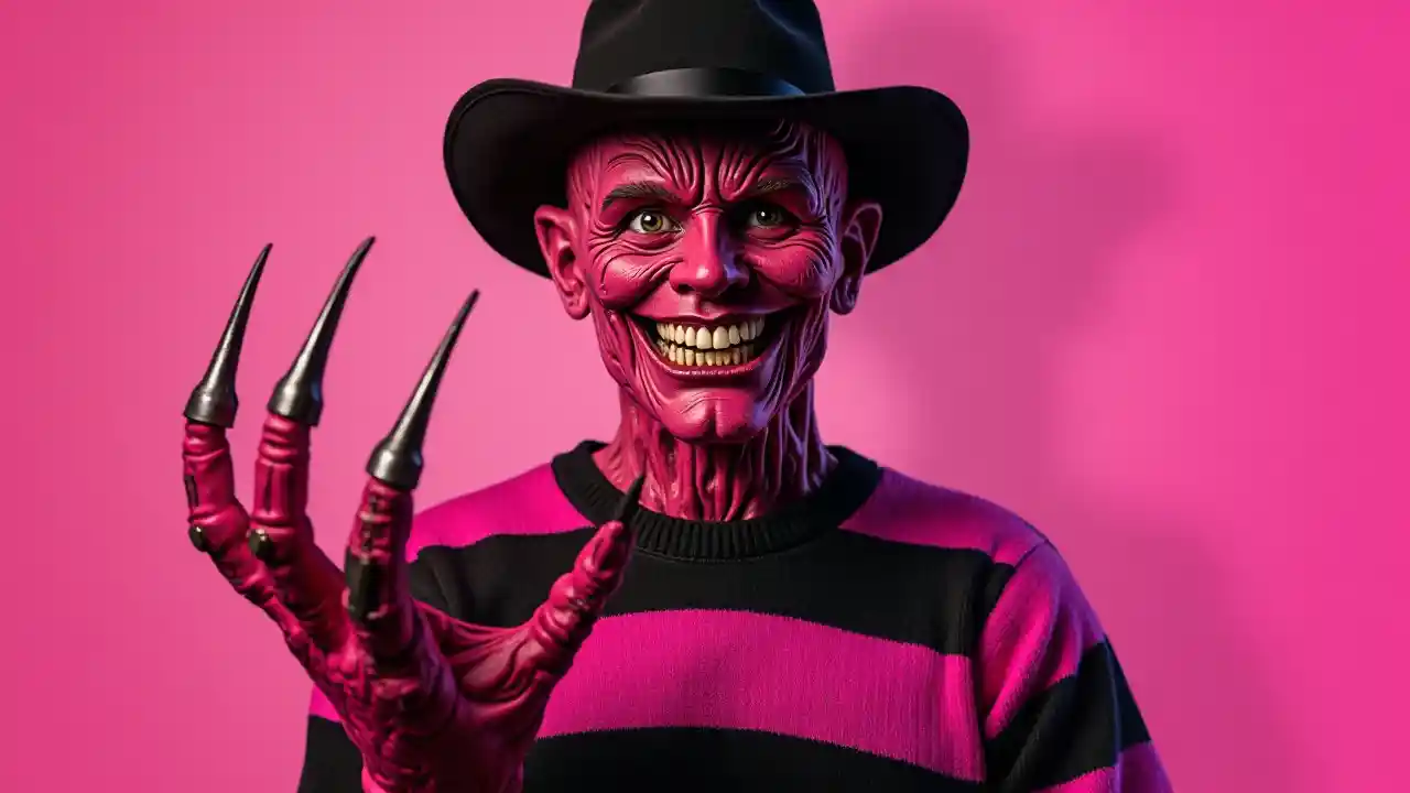 Freddy Krueger, vaaleanpunainen, barbiercore, metallikynnet, vaaleanpunainen pusero, musta hattu, paha hymy, Halloween