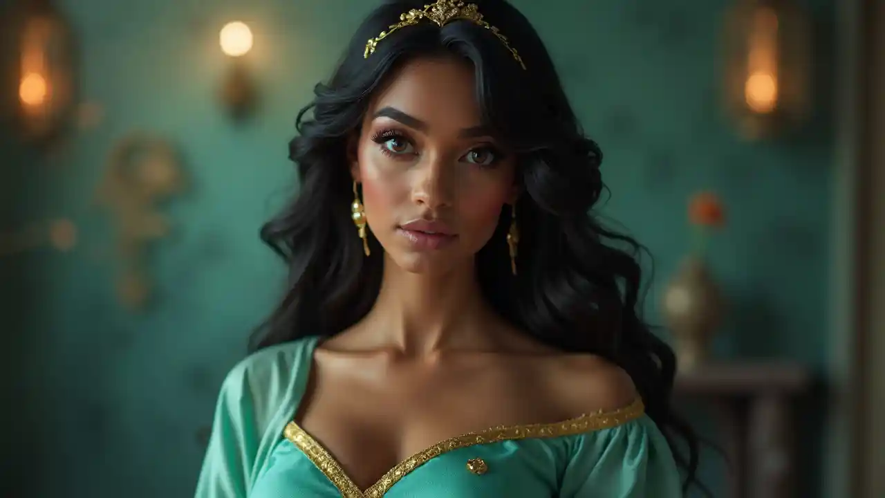 Kaunis prinsessa Jasmine, 8K kuva, elokuvainen tyyli, - hiljainen dramaattinen valo, hämärä bokeh-hinnan, läpinäkyvä kokin turkoosi puku kullalla, - suuret kauniit silmät silmämerkin kanssa, pitkä musta paksu tukka