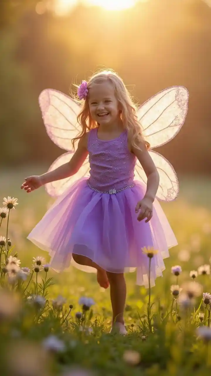 Visualize a little girl wearing a purple fairy costume with glittery wings, flying through a meadow. The soft glow of the afternoon sun enhances the magic of her flight, and her delighted laugh echoes in the serene, enchanted landscape.