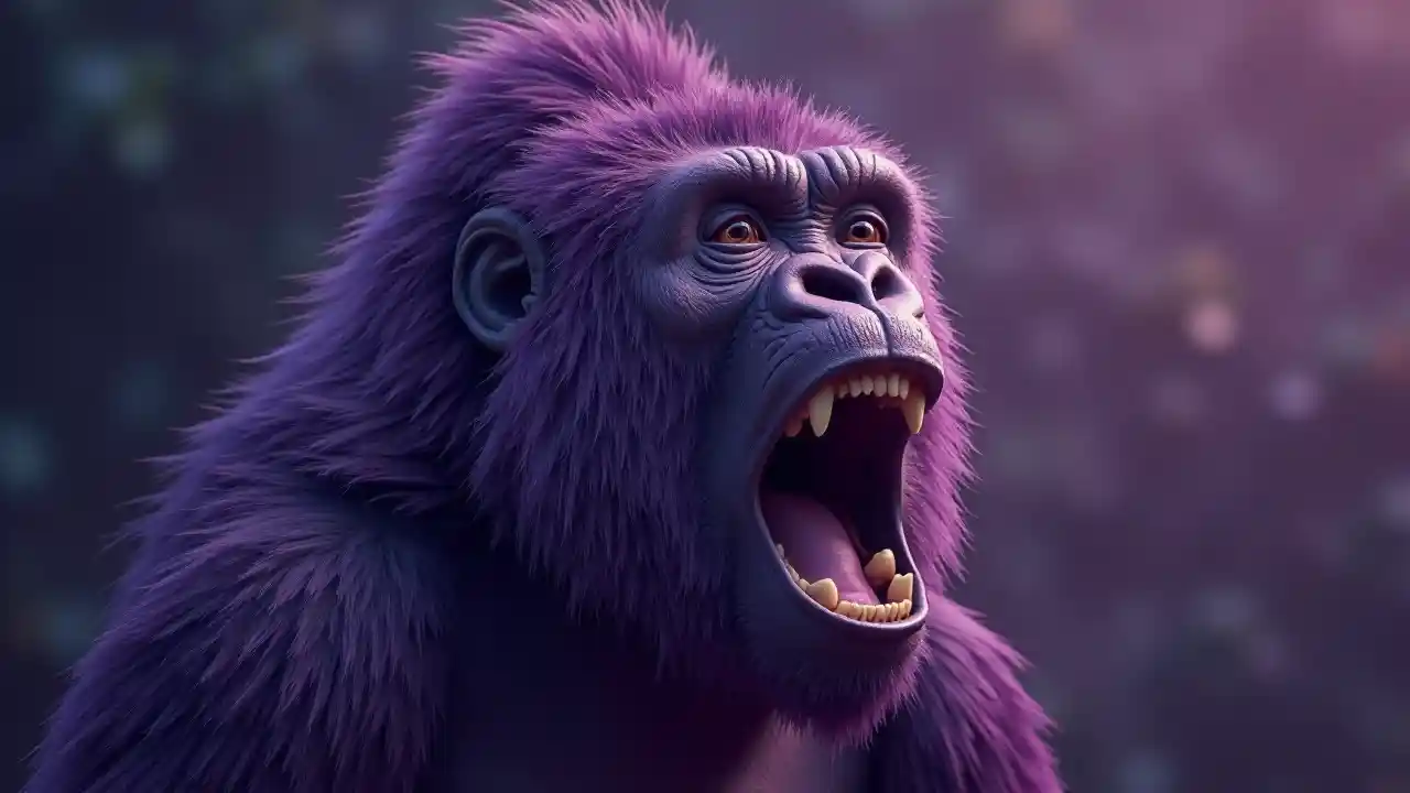 Lähikuva violetti gorillan kasvoista, joissa leijonanharja huutaa