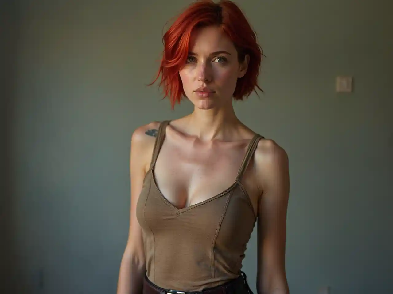 EvelynNainen, 30 vuotta, lyhyt punainen tukka, hyvin tiukka vyö