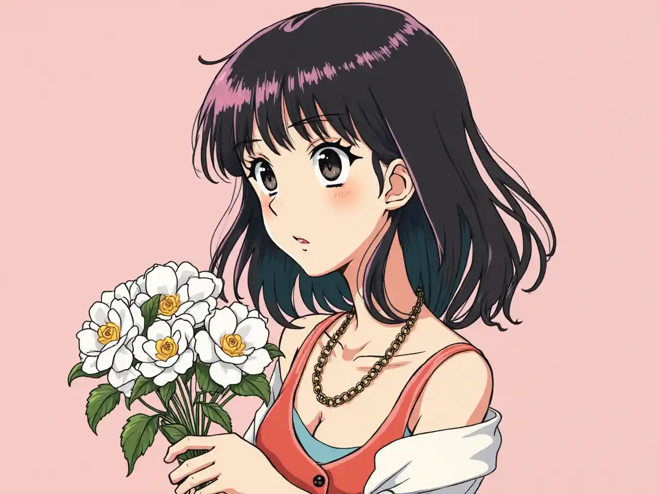 GabrielVanha retro-manga, Takeuchi Keio, Kodama Kanji, suloinen tyttö hartioituneella hiuksella, pitkä musta irisaati RGB-hiuksilla, tasapainoinen, Chanelin korut, -