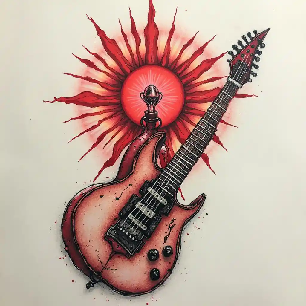 Tatuointi punaisesta auringosta ja kitarasta rockille ja metallille