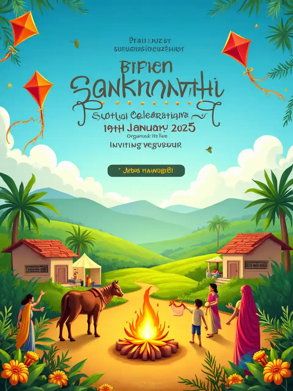 Elävä ja juhlallinen digitaalinen kutsukortti Sankranthin juhliin, joka edustaa täysin perinteistä telugu kyläkulttuuria. Suunnittelussa on ikonisia elementtejä, kuten värikkäitä leijoja, jotka lentävät kirkkaassa sinisessä taivaassa, härkävaunuja, perinteisiä intialaisia mökkejä, vehreitä peltoja, viljelijöitä, jotka keräävät satoja, naisia, jotka tekevät rangoli-malleja, ja juhla-asuja, kuten mangon lehtiä ja kalkkuna-kirvoja. Myös ilon lieke, jonka ympärillä tanssivat ihmiset, joka symboloi Bhogin juhlaa, on mukana. Näytetään näkyvästi tekstiä: "Sankranthi Festival Celebration", "Event Date: 10th January 2025", "Organized by SATA Central", ja "Inviting Everyone" julkeilla ja tyylikkäällä kirjointimellä. Käytä lämpimiä juhlavärejä, kuten oranssia, keltaisia ja vihreitä, herättämään iloa, perinteitä ja kulttuurivarallisuutta. Kokonaistyyli pitäisi tuntua kutsuvalta ja juhlalliselta, täydellinen yhteisötapahtumaksi. Lisää lisää kukkia ja kiljuksia ja lapset leikkivät leijoilla .. Lisää vain kanoja ja leiriä myös
