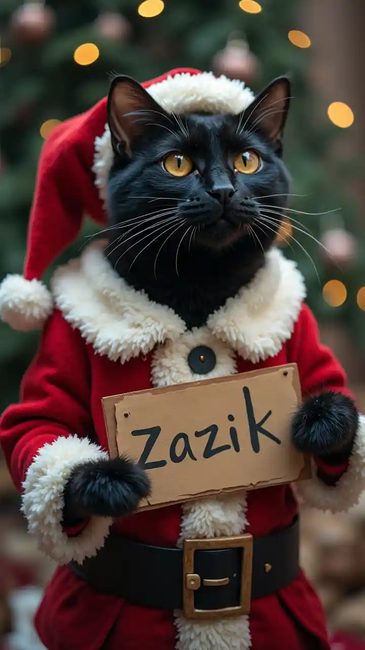 BrooklynMusta kissa, jolla on merkki nimellä Zazik, käyttää joulupukin asuja