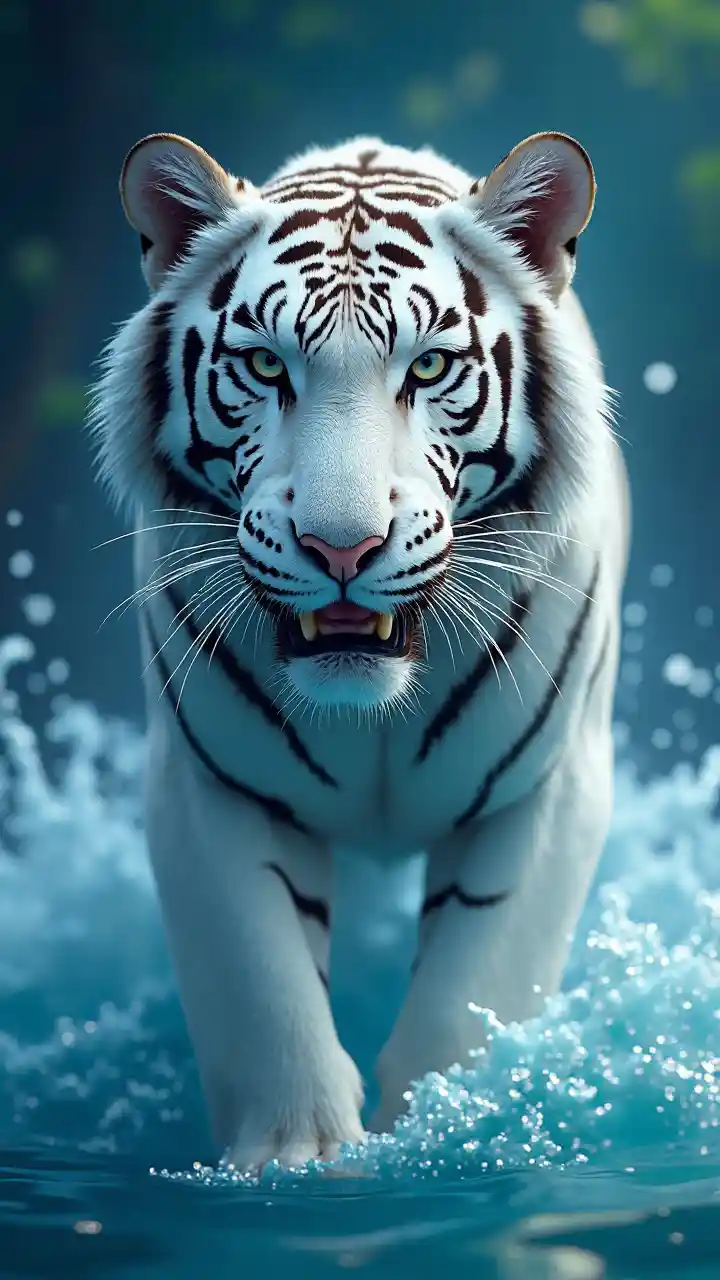 RobinValkoinen tiikeri, jolla on vakava kasvo, jossa on vettä ja sininen tausta, jossa on valot, jossa on sähköinen liike, auto, tähti