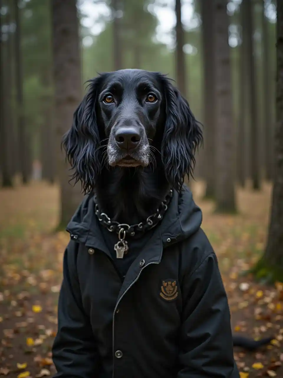 Englantilainen setteri koiran muotokuva, jossa on pätkä metsän ja mustan metallia