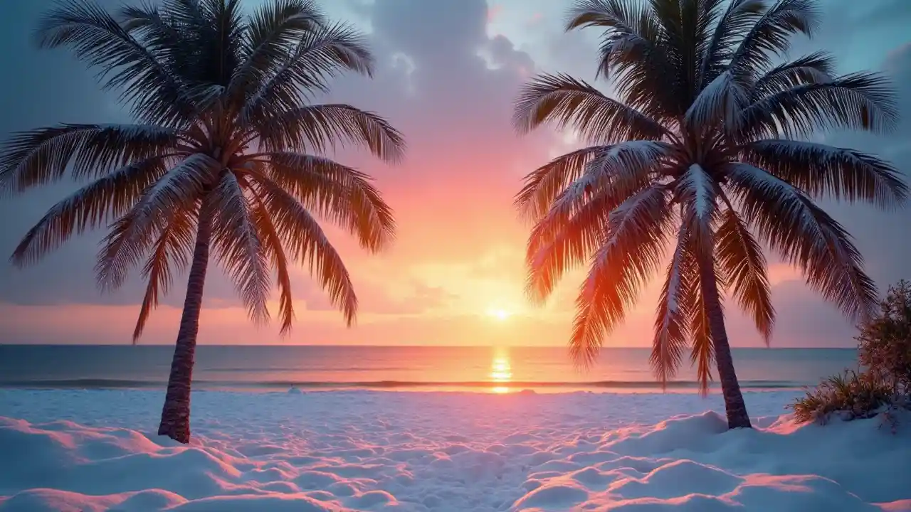 AubreyLumiinen auringonlasku talvella. Palmuja, joiden lehdet ovat lumia.