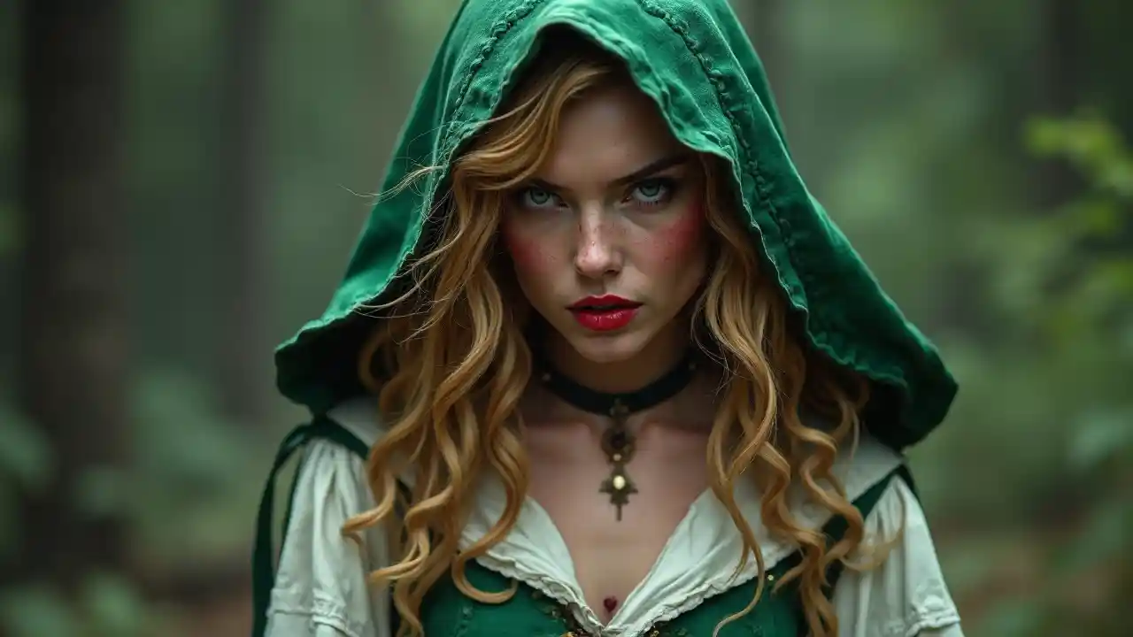 Noitainen nainen, punaiset posket, punaiset huulet, pitkät vaaleat ja kiharat hiukset, siniset silmät, vihreä huopa, vihollinen mieli, keskiaikainen fantasia