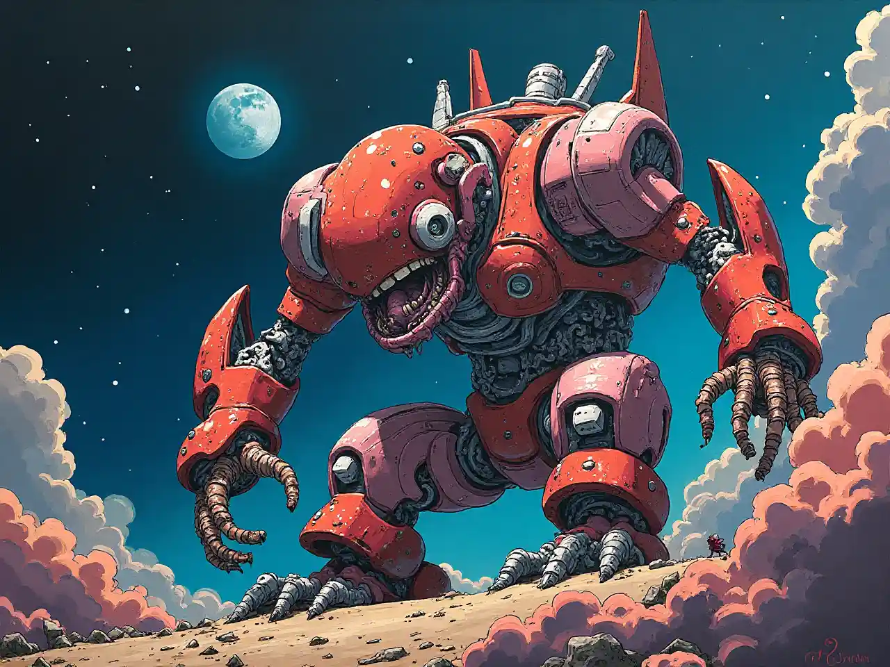 Kuva robotin hirviön fuusiosta avaruudessa olevan muukalaisen kanssa, lauri Greasleyn tyyli, studio Ghibli, Akira Toriyama, James Gilleard, Genshin Impact, trending pixiv fanbox, acrylic palette knife, vibrant colors, devinart, trending on artstation, low details, light colors, dark background, dark background, dark background, dark background, dark background, dark background, dark background, dark background, dark background, dark background, dark background, dark background, dark background, dark background, dark background, dark