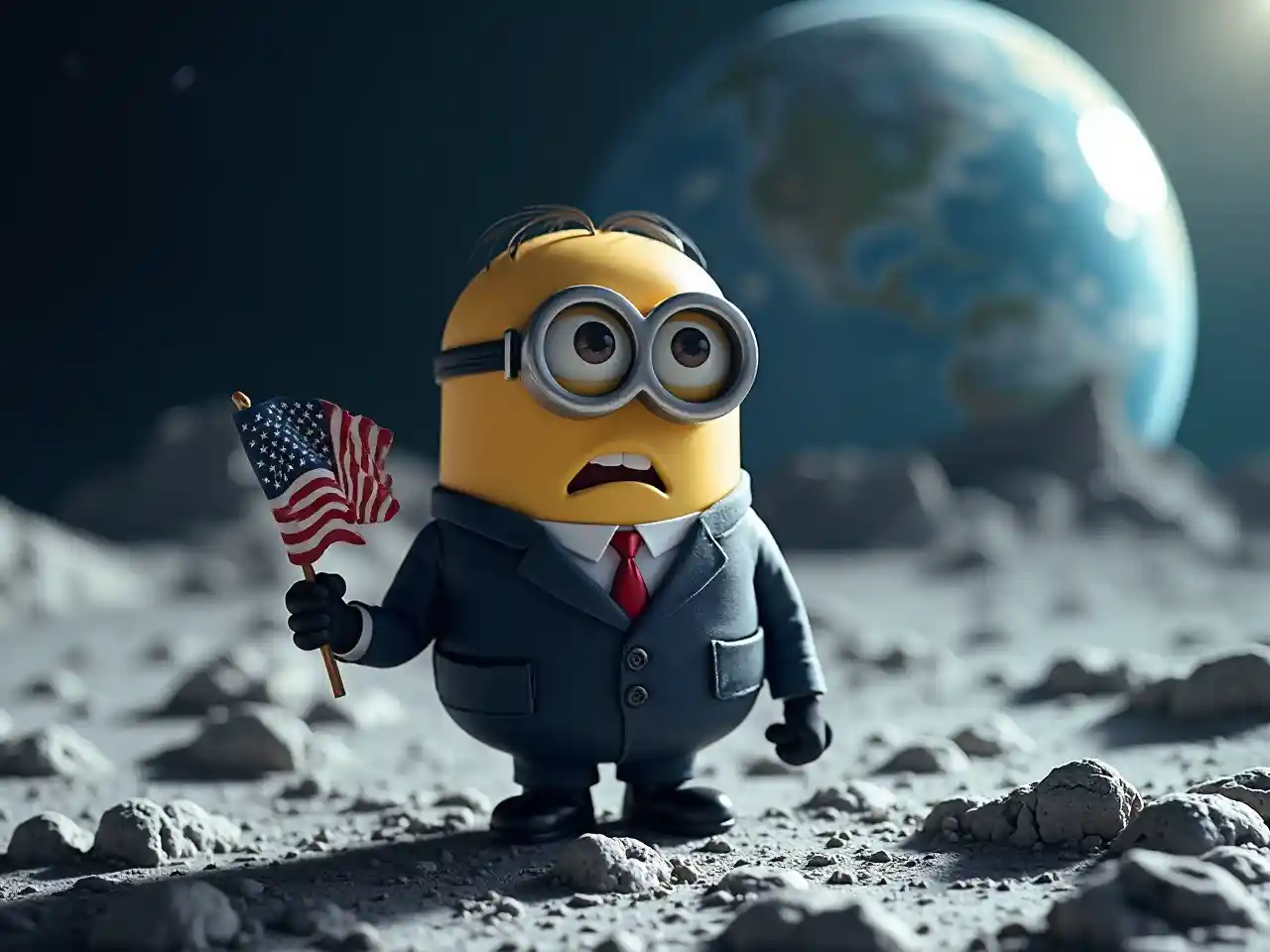 Avaruudesta tullut palvelija, joka pukeutuu presidenttiin, - Amerikan lippulle, kuuhun, maahan