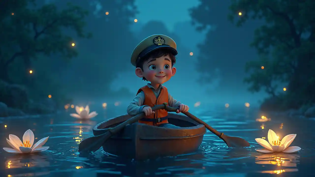 Kuusivuotias valkoinen poika, jolla on pilkut, soutaa venettä tähtijärvellä, jolla on pelastusliivin ja kapteenin hattu. Valoiset lilerit ja tulikäärmeet kuvaavat häntä. Hänen tasaiset vetonsa säteilevät seikkailua ja rauhallista rohkeutta unelmassa vesinä.