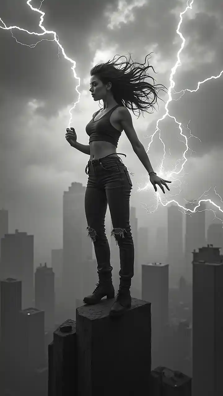Myrskyisen kaupungin silmänräjähdyksen keskellä - hurja nainen seisoo pitkän rakennuksen päällä - ja virittää energiaa räjähdysmäiseen voimankäytökseen - kun hän vapauttaa salamaa kädestä. Hänen villi hiuksensa pyyhkii dramaattisesti ympärilleen, - ja se luo päättäväisen ilmeen, joka säteilee sekä voimaa että uhmautta. Hän on pukeutunut revittyihin tankkipaitoihin ja revityksi farkkuihin. Hän on kapinoiva henki, joka on jyrkkä ja sekasortoinen tausta, jossa on jyrkkä rakennus ja pyöräilevät pilvet. Korkean kontrastin mustavalkoinen tyyli parantaa kohtauksen voimakkuutta, vangitsee hetken, joka tuntuu sähköiseltä ja herättää sekä kamppailun että voimaantumisen tunteen.