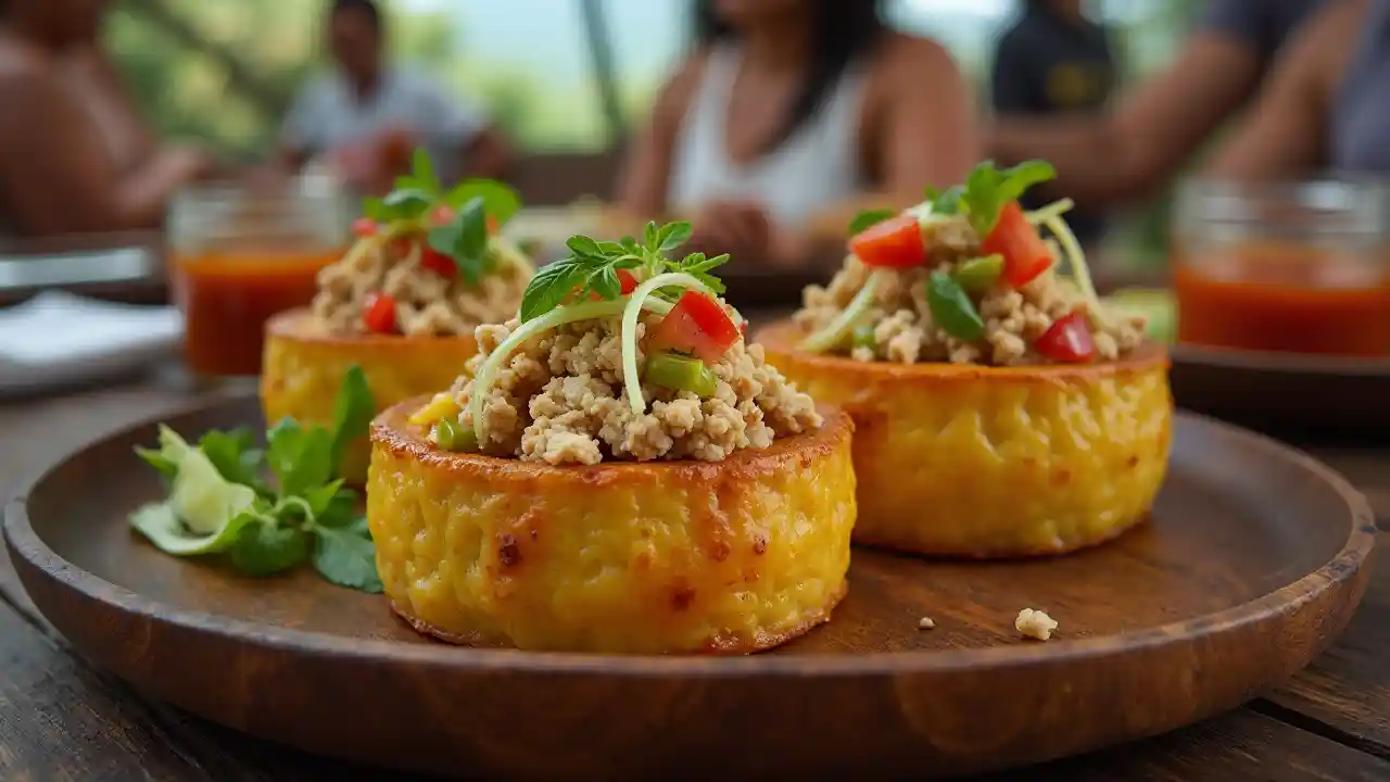 3 pientä täytettyä mustelia (puutikka kastikkeella))), resepti on tehty maaseudulla, jossa on näkymä Puerto Ricon vuorille, 3 pientä täytettyä mustelia ovat jauhettu kanaa, paloitettu tomaatti, salaatti leikattu, puupallo, pöytä, joka on tehty tummasta puusta, pöytä tarjoillaan, taustalla näet ihmisiä, pieni purkki punaisia kastikkeja, jotka on otettu lähellä, 50mm, nikon 35mm ((Puutikka kastikkeella))