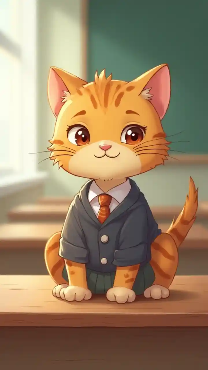 Suloinen oranssi-pussiksen piirretty hahmo, jolla on koulupuku, istuu luokkahuoneen pöydällä.