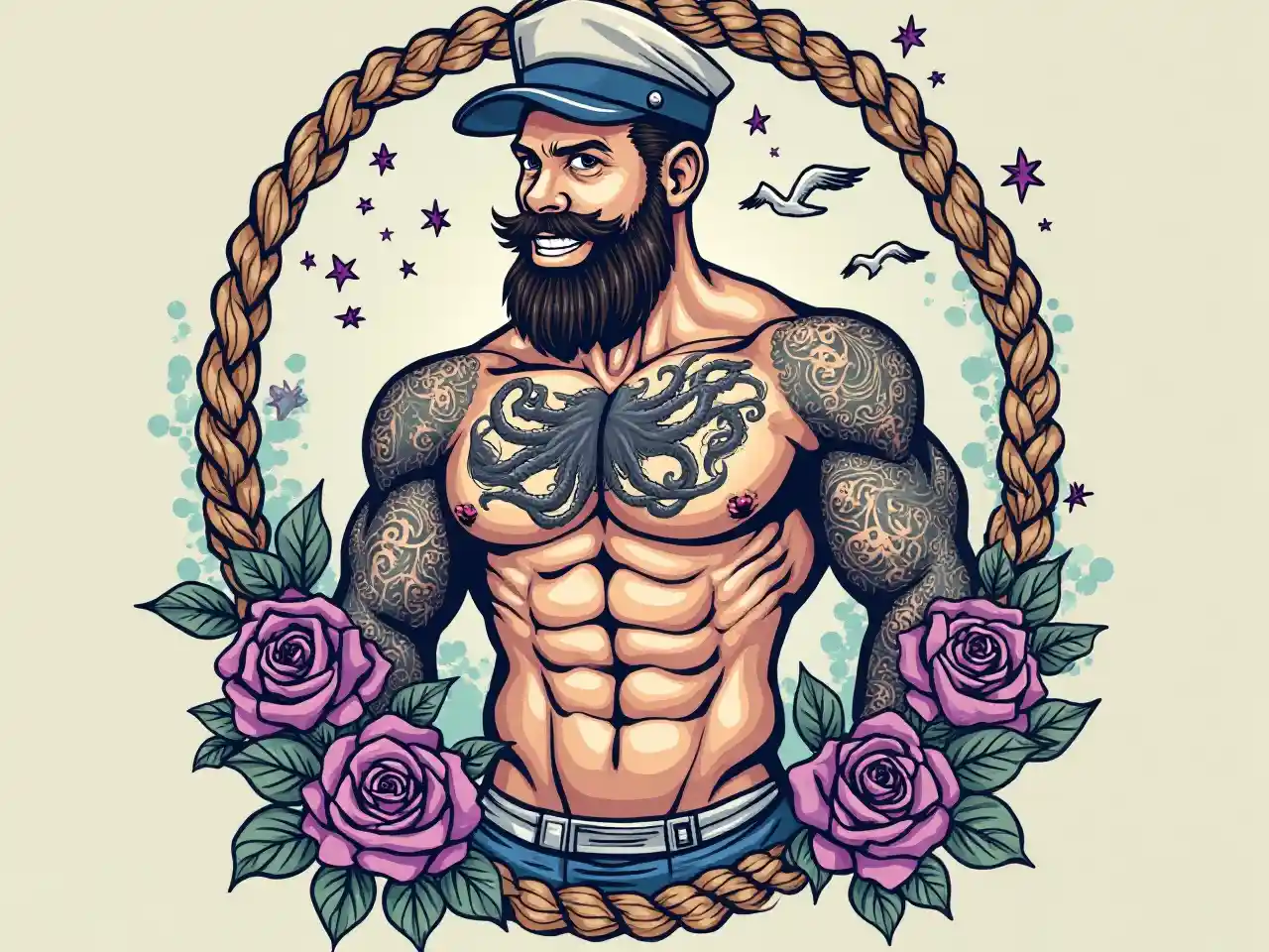 Vintage-tatuaatio, jossa on lihaksikas ja parrakas latino. Hänellä on monimutkaiset tatuoinnit, kuten mustekalan rinnalla, ja hänellä on vanha merimiehappi ja. Paletissa on rohkeita piirroksia ja haurauksia, kuten violetti, salvia ja teal. Luodaan tausta, jossa on merimerkkejä, kuten köysi, hajallaan olevat tähdet, albatros-lintu ja violetti ruusut, jotta tatuointi on estetistä.