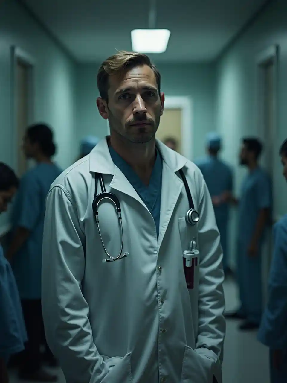 Nuori lääkäri, mies, hyvin väsynyt ja raukeutunut, likaisessa valkoisessa takissa, yövuorossa, - täynnä sairaala käytävällä, jossa on monia potilaita ja hoitajia, ilman stetoskoopia, valo keskittyy hänen kasvoihinsa