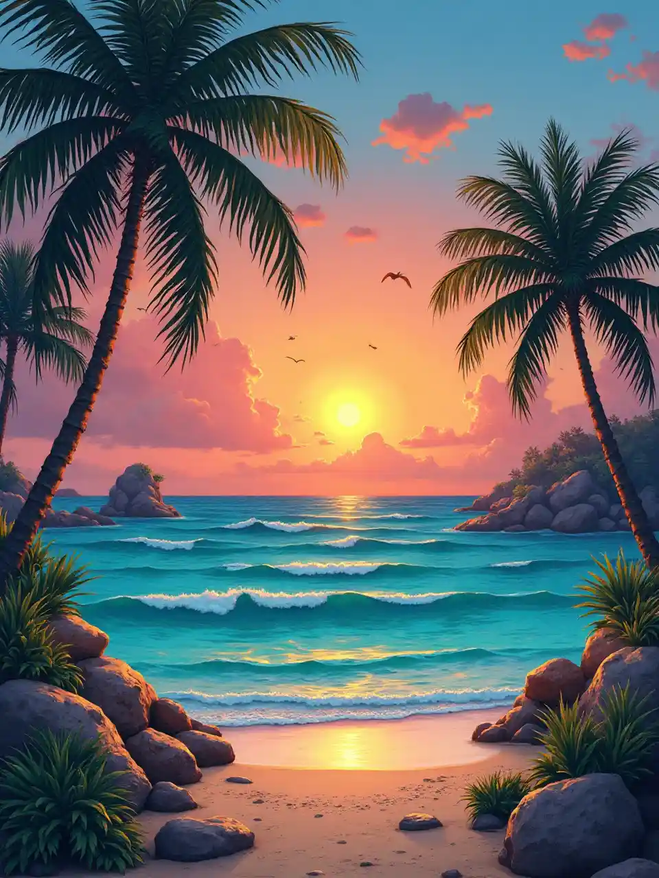Aamunkoitto, ranta, meri, trooppiset, elävät värit, maisemat, linnut <lora:add-detail-xl:1>
