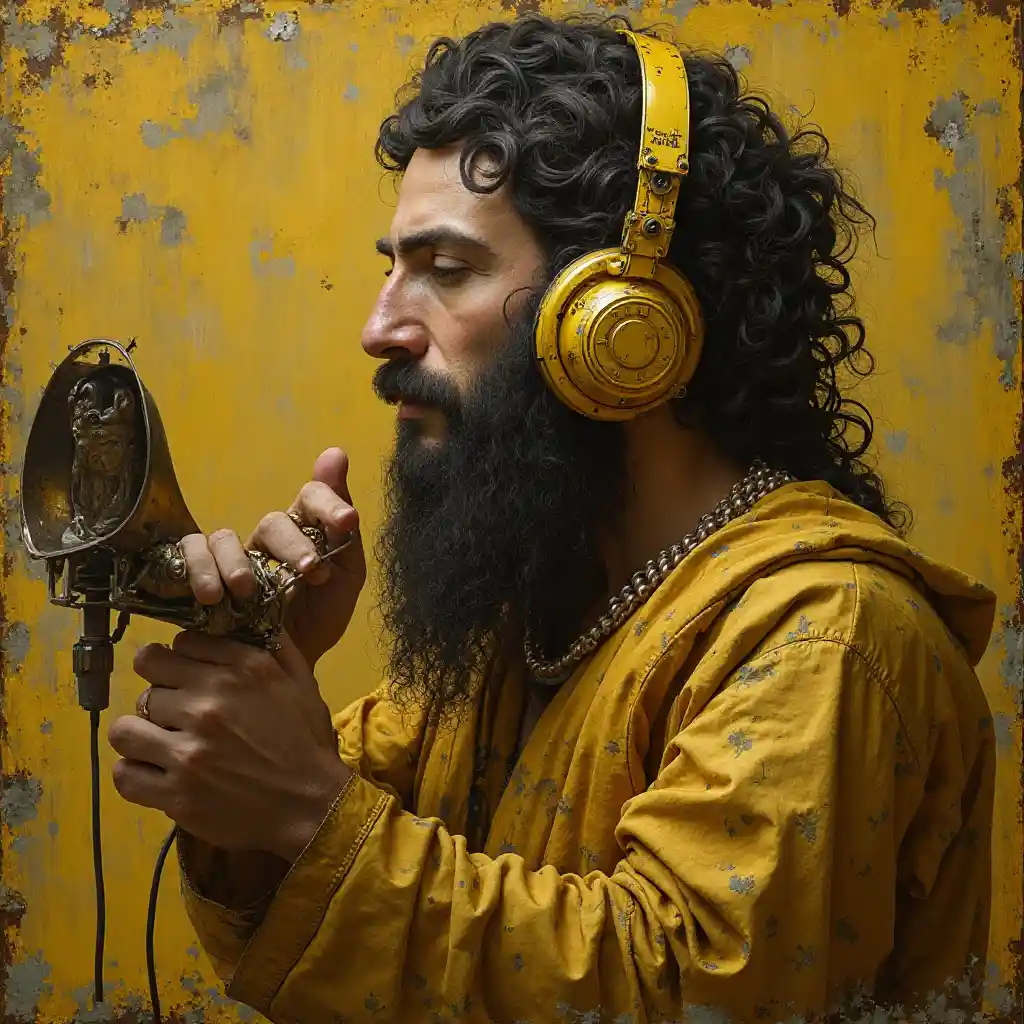 Kuuntele musiikkia keltaisella kuulokkeella, raskasmetalli sarvet kädessä, renessanssin taide, keltaiset yksityiskohdat